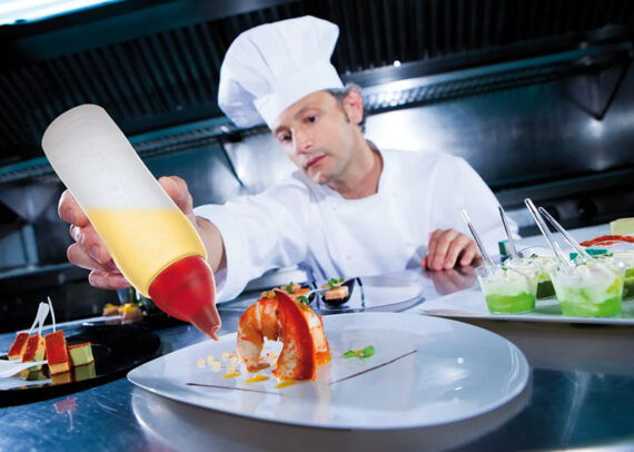 Actualmente los dosificadores de salsas, o más conocidos como biberones, se encuentran por docenas en todas las cocinas profesionales. Damos por hecho que han estado siempre en las cocinas pero no es así. Fue en la década de los noventa cuando el Chef Ferrán Adriá los introduce en su cocina inspirándose en los famosos dosificadores de kétchup y mostaza. A partir de ese momento comenzaron a utilizarse para aliñar ensaladas o cualquier otra elaboración y han terminado convirtiéndose en una herramienta imprescindible para la decoración de los platos de forma precisa y limpia. Los biberones de cocina permiten introducir todo tipo de aderezos, más ligeros o más espesos, aceites, salsas, reducciones…