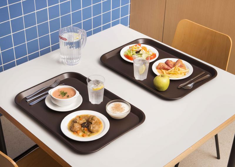 Bandejas de servicio con robustez y resistencia. La bandeja Fast Food verde 458 x 355mm. está fabricada en Polipropileno, un material muy resistente que la hace ideale para restaurantes de servicio rápido, autoservicio y restauración de colectividades. La misma pieza tiene la superficie texturizada para evitar el deslizamiento del contenido. Son encajables y van provistas de unos puntos de apoyo que permiten la recirculación del aire entre bandejas mientras están apiladas, lo que favorece un correcto secado.