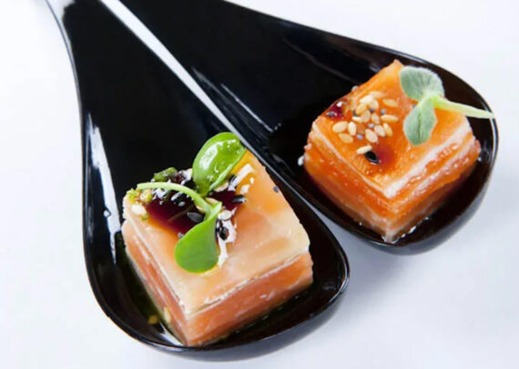 MILHOJAS DE SALMÓN Y SOJA Ingredientes: -Salmón -Salsa de soja -Sésamo tostado -Queso mascarpone -Brotes de tomate -Aceite de oliva y sal maldón Elaboración: 1º. Sobre una superficie plana extender finas lonchas de salmón ahumado y de queso mascarpone estirado con una espátula, alternando hasta cinco capas de salmón y cuatro de queso e intentando mantener el mismo grosor … Continued