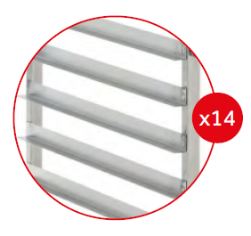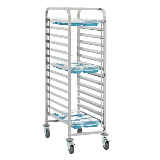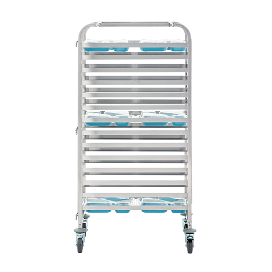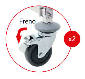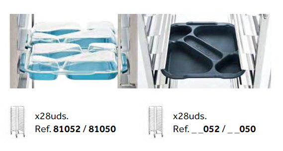 El carro portabandejas permite que los comensales depositen la bandeja 5 compartimentos en desuso para poder llevarlas a la zona de lavado. Tiene una capacidad de hasta 28 bandejas y barra de cierre para evitar caídas. Las 4 ruedas son 360º  y dos de ellas tienen freno.
