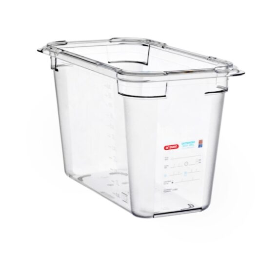 Los contenedores en policarbonato están pensados y diseñados para los profesionales de la hostelería.Las cubeta sin tapa policarbonato GN 1/1 de altura 65 mm y 8.35 litros tienen etiqueta de trazabilidad integrada, ayudan a cumplir con la normativa higiénico-sanitaria, son totalmente transparentes para identificar rápidamente el alimento que contiene.