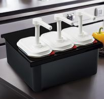 Soporte de 3 dispensadores para salsas, aderezos ligeros y jarabes. Mejora la presentación de las salsas en las zonas de Servicio y exposición y facilita el trasporte a las zonas de conservación. Se mantiene la temperatura de las salsas del dispensador mediante la introducción de agua con hielo o agua caliente en el interior de la cubeta GN 2/3 negra.