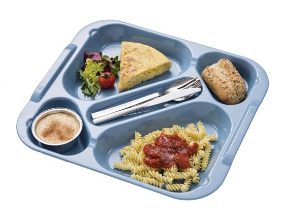 The tray has spaces for different foods so there is no need for plates. Five compartments: two large ones for main dishes, two small ones for dessert, fruit, bread, a glass… with a rectangular space in the centre for cutlery. Food compartments have notches to rest the cutlery on while in use and to stop them from sliding into the spaces. The side grips on the tray makes it easy to hold and carry, even for children. Indeed, the tray containing food can be covered by an empty inverted tray to protect the food until it is ready to be eaten.