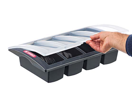 ARAVEN’s GastroNorm 1/1 cutlery holder with 4 compartments is compatible with the rest of facilities at the establishment. The cutlery tray with a lid protects utensils, even from ambient exposure in the room, until use.