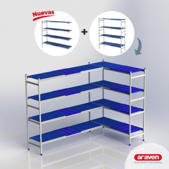 Maximize space with our extendable corner shelving unit, designed to improve accessibility and make the most of every corner in cold rooms, freezers, and restaurant storage areas. Its innovative design optimizes space and enhances the visibility of stored products, ensuring efficient organization. Moreover, it is compatible with Araven’s fixed and extendable shelving systems, allowing seamless integration into any professional storage system.