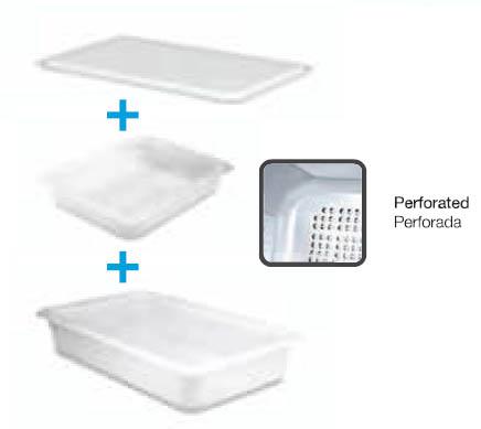 Araven’s GastroNorm flouring dish has a lid that can be used as a GastroNorm tray by just turning it over, which is very useful for placing food on it whilst in the process of preparation. In addition, it is three times lighter than steel, more hygienic and safer, as it has no sharp edges and no nooks where food remains can accumulate.