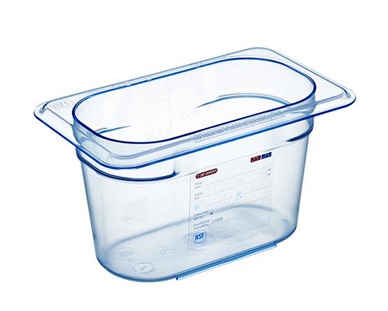 The GN 1/9 h 100mm – 4″ 0,7l./ 0,74qt-  airtight containers BPA Free with lids are conceived and designed for catering professionals. The GastroNorm size containers have integrated traceability labels, they help comply with the health and hygiene regulation, they are totally transparent to quickly identify the food they contain. Their bi-injection moulded lid with rubber seal ensures maximum protection of foodstuff even in large containers.