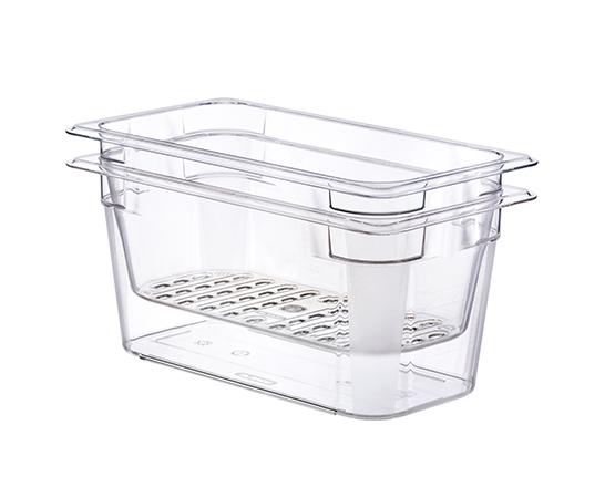 The ridged design allows liquids to drain to the base pan much more quickly. This means faster thawing times too. The perforated food pan remains separate from the edge of the non-perforated food pan during stacking. This position makes it easy to lift out and handle.