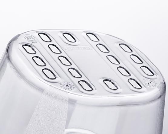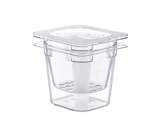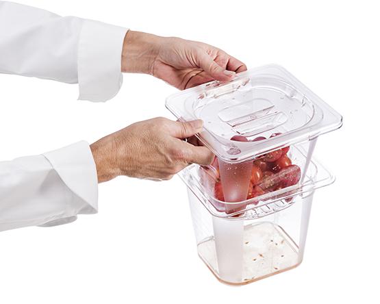 The ridged design allows liquids to drain to the base pan much more quickly. This means faster thawing times too. The perforated food pan remains separate from the edge of the non-perforated food pan during stacking. This position makes it easy to lift out and handle.