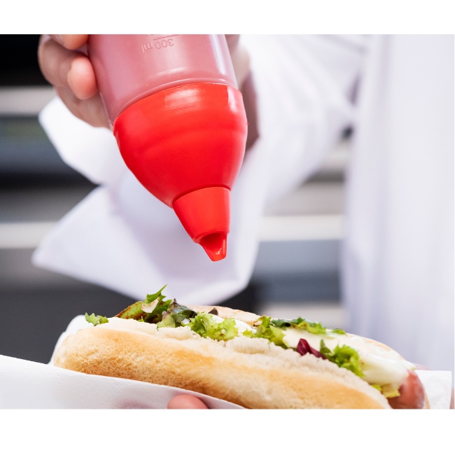 Bottle with anti-drip silicone valve. The anti-drip valve prevents clogging and the accumulation of sauce residue in the outlet hole.
