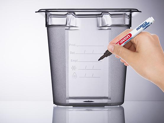 Con el grabado superficial en pieza y usando el rotulador Araven Horeca Marker para escribir sobre esta parte de la cubeta, podemos identificar el contenido preservando la información asociada a su origen o su manipulación (fechas de elaboración, caducidad o procedencia).