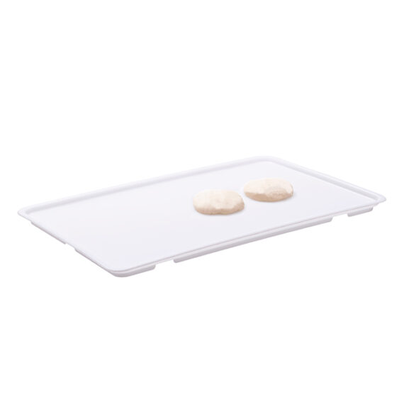 Drop-on lid which adjusts to the edge of the stackable dough box to protect its contents against environmental exposure and prevent the risk of external contamination. The lid has a clean surface for additional use as a tray