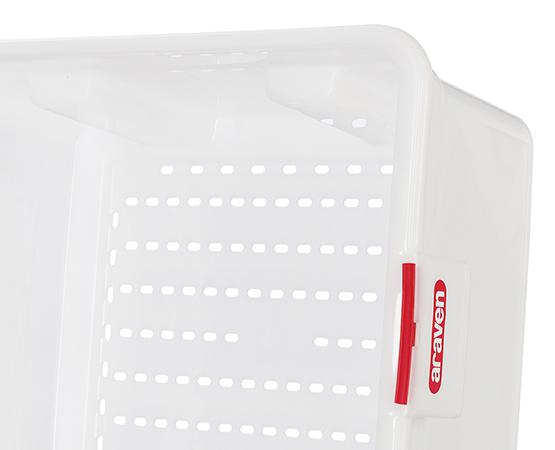 Système de décongélation – Les aliments seront placés à l’intérieur d’un bac perforé emboîté dans l’autre bac qui recueillera le liquide dégagé en évitant qu’il goutte et contamine d’autres aliments à proximité. Dans le bac inférieur, le liquide dégagé par l’aliment durant la décongélation (exsudat ou glaçage/liquide couverture) est recueilli afin qu’il ne se mélange pas à l’aliment. Il faudra protéger l’aliment avec un couvercle pour éviter les contaminations.