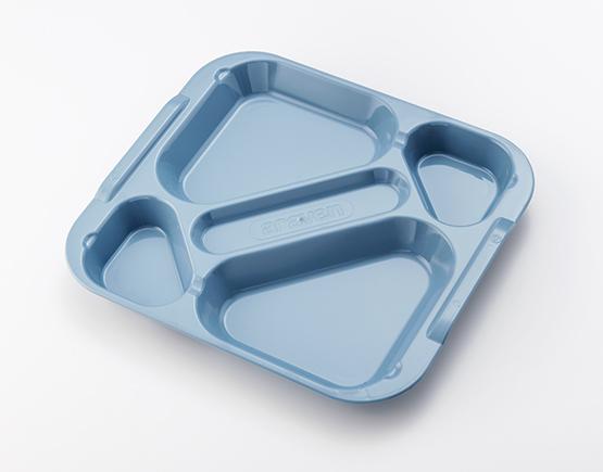 Les plateaux permettent de présenter les aliments sans assiettes. Ils sont dotés de cinq compartiments : deux grands pour le plat principal, deux petits pour le dessert, fruit, pain, verre… et un compartiment rectangulaire au centre pour y loger les couverts. Les compartiments alimentaires sont dotés d’encoches latérales pour que les couverts ne glissent pas à l’intérieur du compartiment. Ses anses latérales facilitent sa manipulation et son transport, même pour les utilisateurs les plus jeunes. En plus, on peut couvrir le plateau contenant les aliments par simple rotation avec un autre
