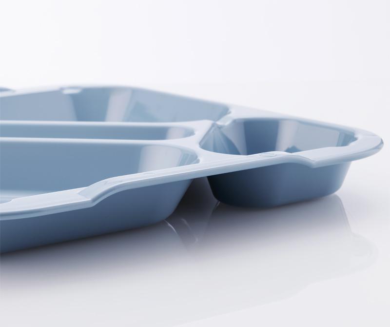 Les plateaux permettent de présenter les aliments sans assiettes. Ils sont dotés de cinq compartiments : deux grands pour le plat principal, deux petits pour le dessert, fruit, pain, verre… et un compartiment rectangulaire au centre pour y loger les couverts. Les compartiments alimentaires sont dotés d’encoches latérales pour que les couverts ne glissent pas à l’intérieur du compartiment. Ses anses latérales facilitent sa manipulation et son transport, même pour les utilisateurs les plus jeunes. En plus, on peut couvrir le plateau contenant les aliments par simple rotation avec un autre plateau vide qui servira de couvercle. Protège les aliments jusqu’au moment du repas.