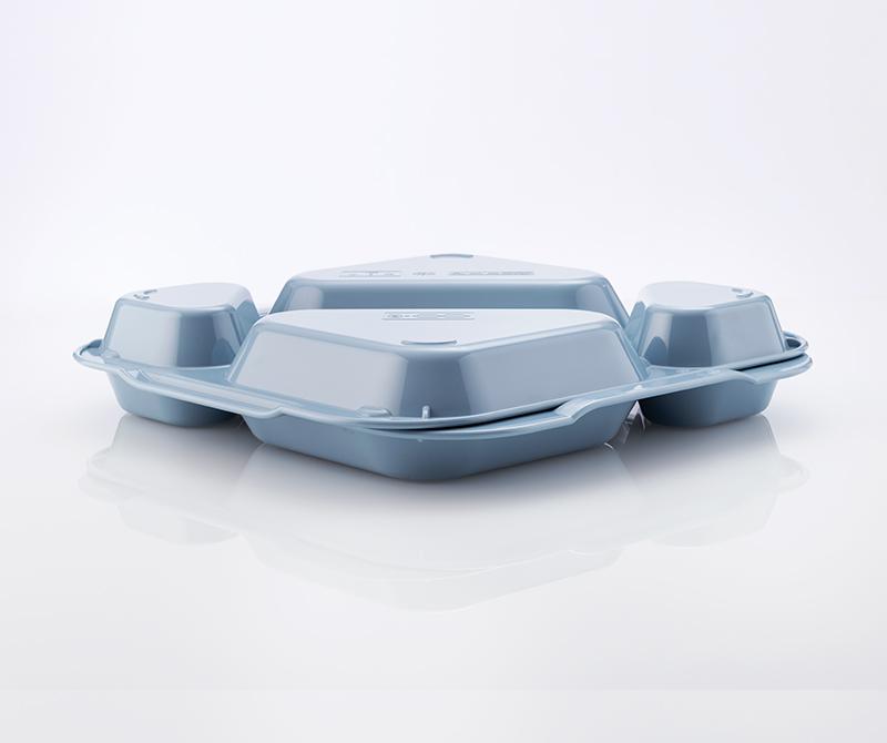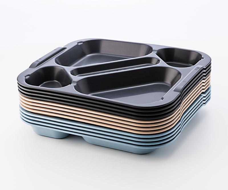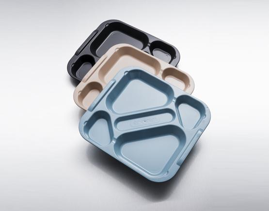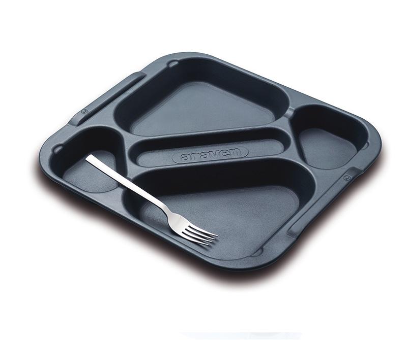 Les plateaux permettent de présenter les aliments sans assiettes. Ils sont dotés de cinq compartiments : deux grands pour le plat principal, deux petits pour le dessert, fruit, pain, verre… et un compartiment rectangulaire au centre pour y loger les couverts. Les compartiments alimentaires sont dotés d’encoches latérales pour que les couverts ne glissent pas à l’intérieur du compartiment. Ses anses latérales facilitent sa manipulation et son transport, même pour les utilisateurs les plus jeunes. En plus, on peut couvrir le plateau contenant les aliments par simple rotation avec un autre plateau vide qui servira de couvercle. Protège les aliments jusqu’au moment du repas.