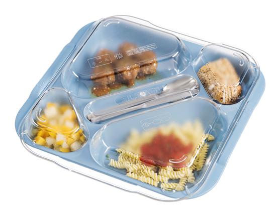 Les plateaux permettent de présenter les aliments sans assiettes. Ils sont dotés de cinq compartiments : deux grands pour le plat principal, deux petits pour le dessert, fruit, pain, verre… et un compartiment rectangulaire au centre pour y loger les couverts. Les compartiments alimentaires sont dotés d’encoches latérales pour que les couverts ne glissent pas à l’intérieur du compartiment. Ses anses latérales facilitent sa manipulation et son transport, même pour les utilisateurs les plus jeunes. En plus, on peut couvrir le plateau contenant les aliments par simple rotation avec un autre plateau vide qui servira de couvercle. Protège les aliments jusqu’au moment du repas.