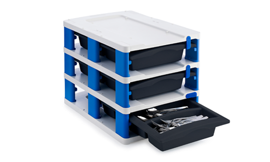 Le range-couverts d’ARAVEN à 4 compartiments, aux mesures GastroNorme 1/1 qui le font compatible avec le reste des installations de l’établissement. Le range-couverts à couvercle permet de protéger les ustensiles, y compris de l’exposition environnementale, jusqu’à leur utilisation.