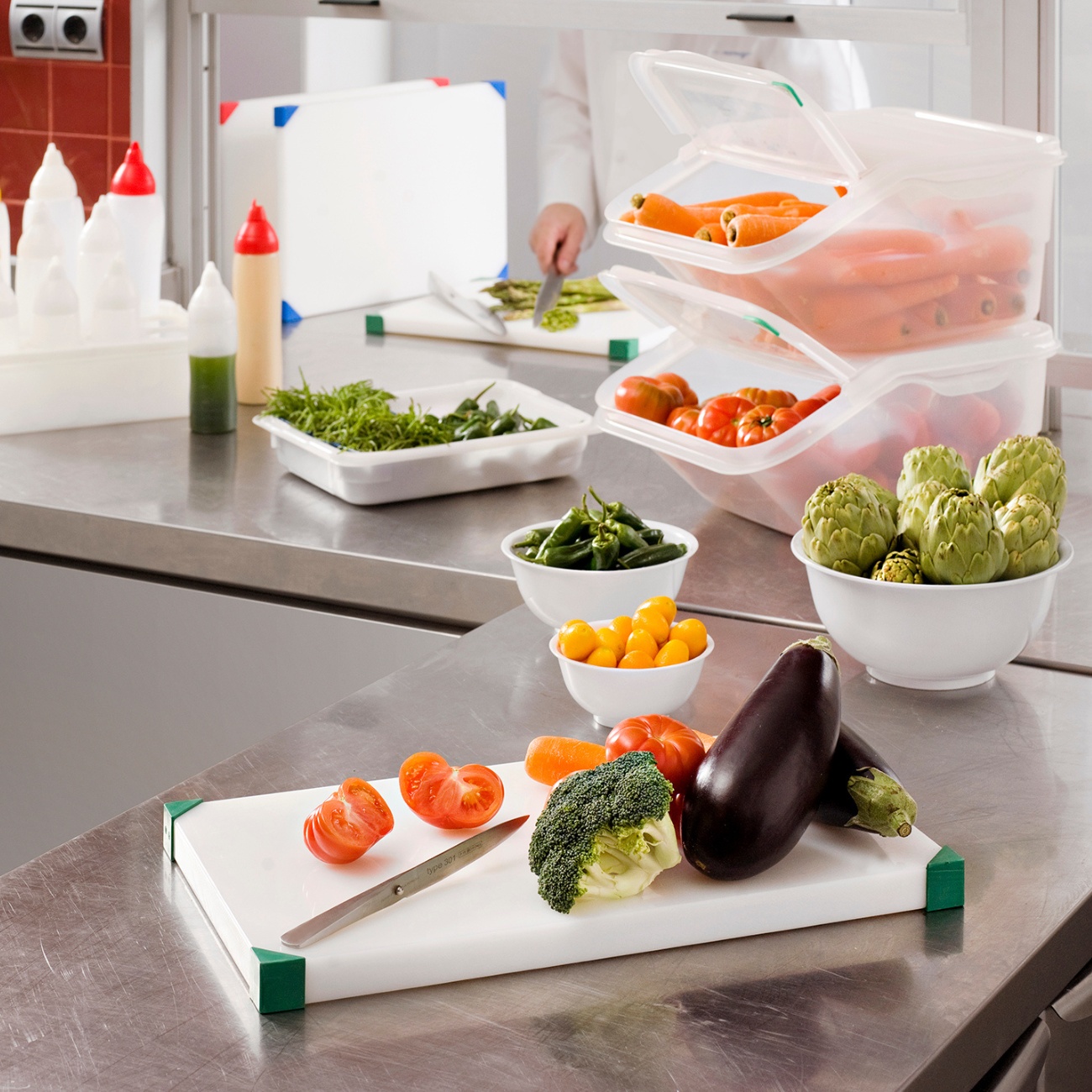 Le coin coloré de la planche identifie le type d’aliment à manipuler. La planche à découper Araven possède des coins colorés permanents, qui permettent de différencier ces plans de travail en fonction des groupes d’aliments à manipuler, évitant ainsi la contamination croisée. Cette différenciation est particulièrement importante entre les aliments crus et les aliments transformés.