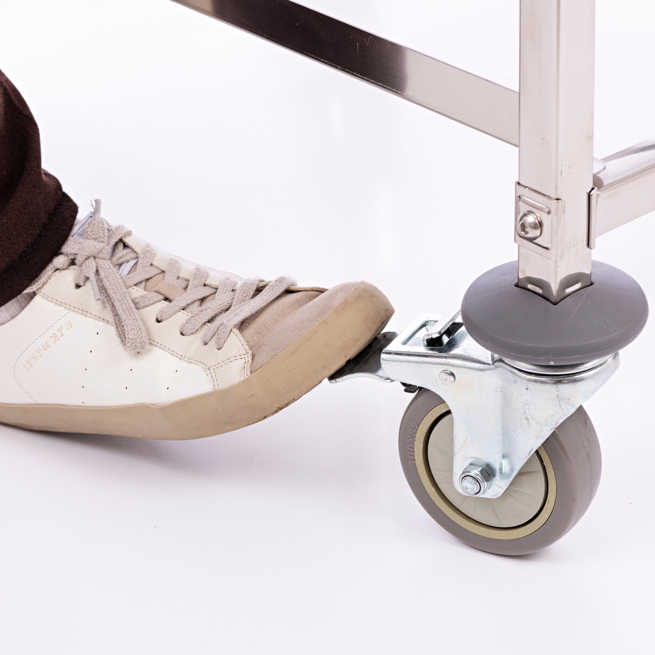 Le chariot a une capacité de 18 Bac GN 1/1 et une barre de fermeture pour éviter les chutes. Sur la partie supérieure des roulettes, le chariot est équipé d’une protection en caoutchouc pour éviter les coups. Les 4 roulettes sont 360º et 2 roulettes ont frein.