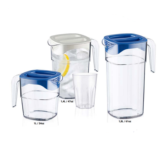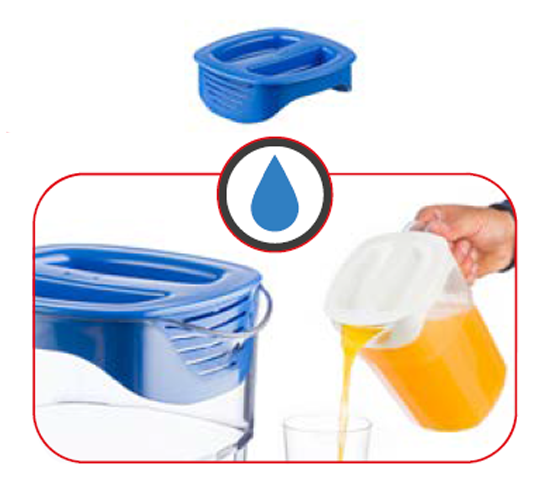 El diseño exclusivo de las tapas para jarras apilables, además de proteger el contenido de la jarra de contaminaciones externas, tiene una doble posición para permitir: