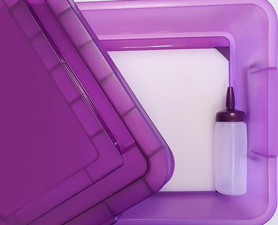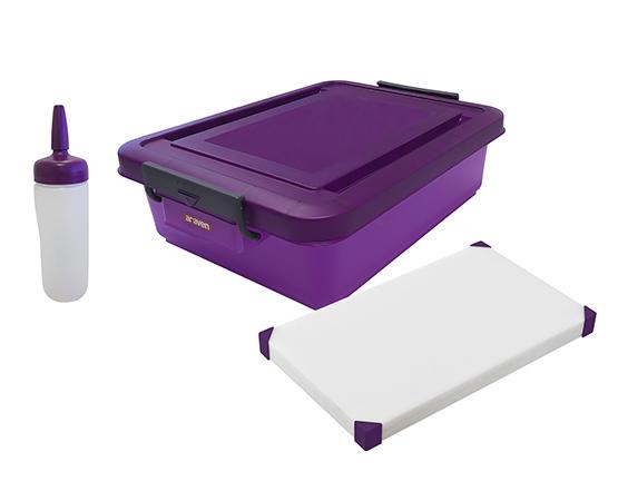 El Kit antialérgenos está compuesto por una cubeta de gran capacidad de 30 litros con tapa en polipropileno para el transporte alimentario y utensilios antialergenos. Incluye una tabla de corte (404x304x24 mm.) y dosificador de salsas en color morado con una capacidad de 35 cl.