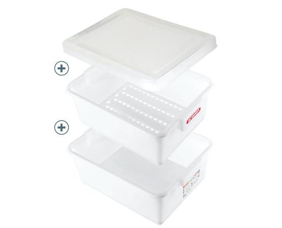 El kit de descongelación está diseñado pensando en la seguridad alimentaria en la cocina profesional. Consta de 3 piezas: tapa, cubeta perforada y cubeta para la recogida del exudado.
