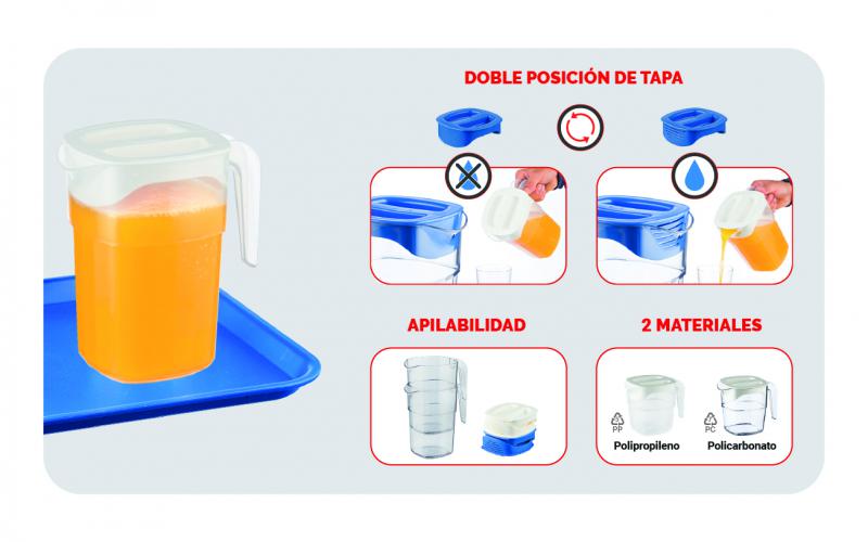 Las jarras están disponibles en tres capacidades (1 litro, 1,4 litros y 1,8 litros), que como una ventaja más comparten la misma tapa. Se ofrecen en dos materiales: polipropileno, libre de BPA; y policarbonato. Las dos opciones son reutilizables y reciclables, muy duraderas, e idóneas para el uso en restauración: transparentes y permiten el lavado en lavavajillas.