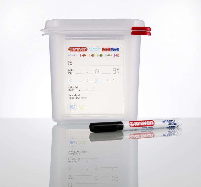 Diseñado especialmente por Araven para ayudar al hostelero a cumplir con la normativa de trazabilidad. Para facilitar el uso del contenedor con la etiqueta, Araven pone a su disposición un rotulador HORECA marker de tinta permanente a base de agua, resistente al roce y a la condensación y de fácil limpieza en el lavavajillas. Basta con que escriba en la etiqueta los datos necesarios y una vez llegue el momento de lavar el contenedor comprobará como su escritura se elimina fácilmente en el lavado o frotando suavemente bajo un chorro de agua caliente.