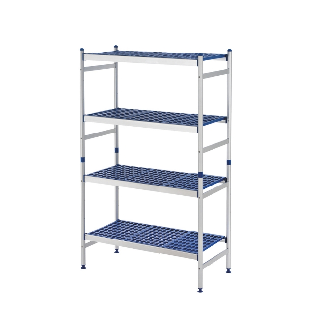 Estructura de aluminio anodizado de gran resistencia mecánica y a la corrosión. Estantes regulables en altura cada 150 mm.