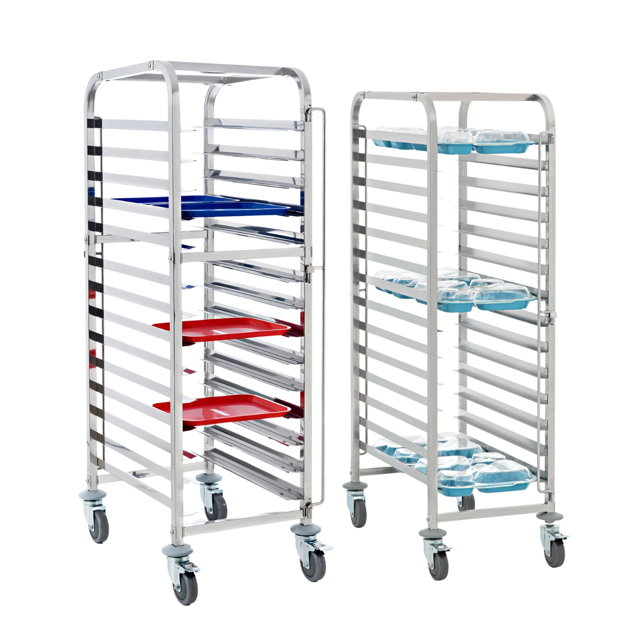 Los carros portabandejas permiten que los comensales depositen la bandeja en desuso para poder llevarlas a la zona de lavado. Fabricados en inox. En la parte superior de la ruedas, el carro cuenta con una goma de protección para los golpes. Las 4 ruedas son 360º y dos de ellas tienen freno.